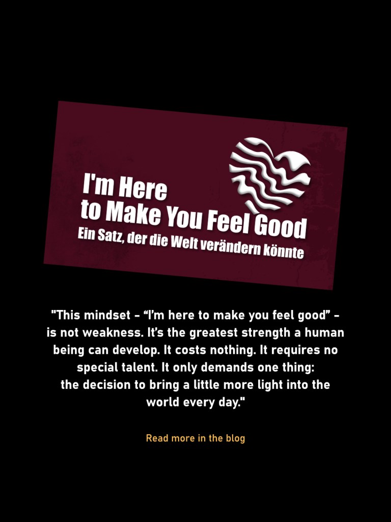 Es gibt einen Satz, der die Macht hat, die Welt zu verändern. Nicht durch große Gesten oder revolutionäre Taten, sondern durch die stille Transformation unseres täglichen Miteinanders. Dieser Satz lautet: „I’m here to make you feel good.“